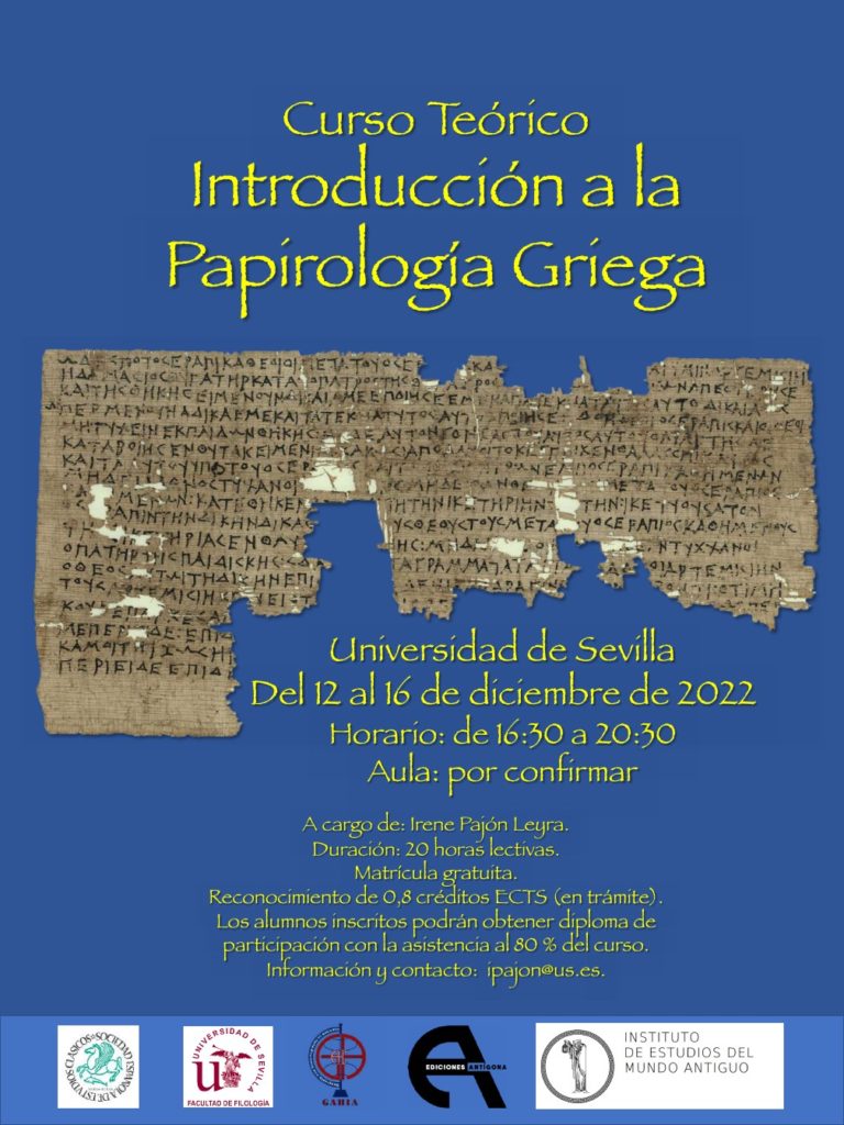La Universidad de Sevilla ofrece un curso teórico de ‘Introducción a la papirología griega’ del 12 al 16 de diciembre de 2022, en horario de 16:30 a 20:30 horas. El aula aún está por confirmar. La profesora encargada de impartir tal curso es Dña. Irene Pajón Leyra, vocal de Sevilla de la SEEC.