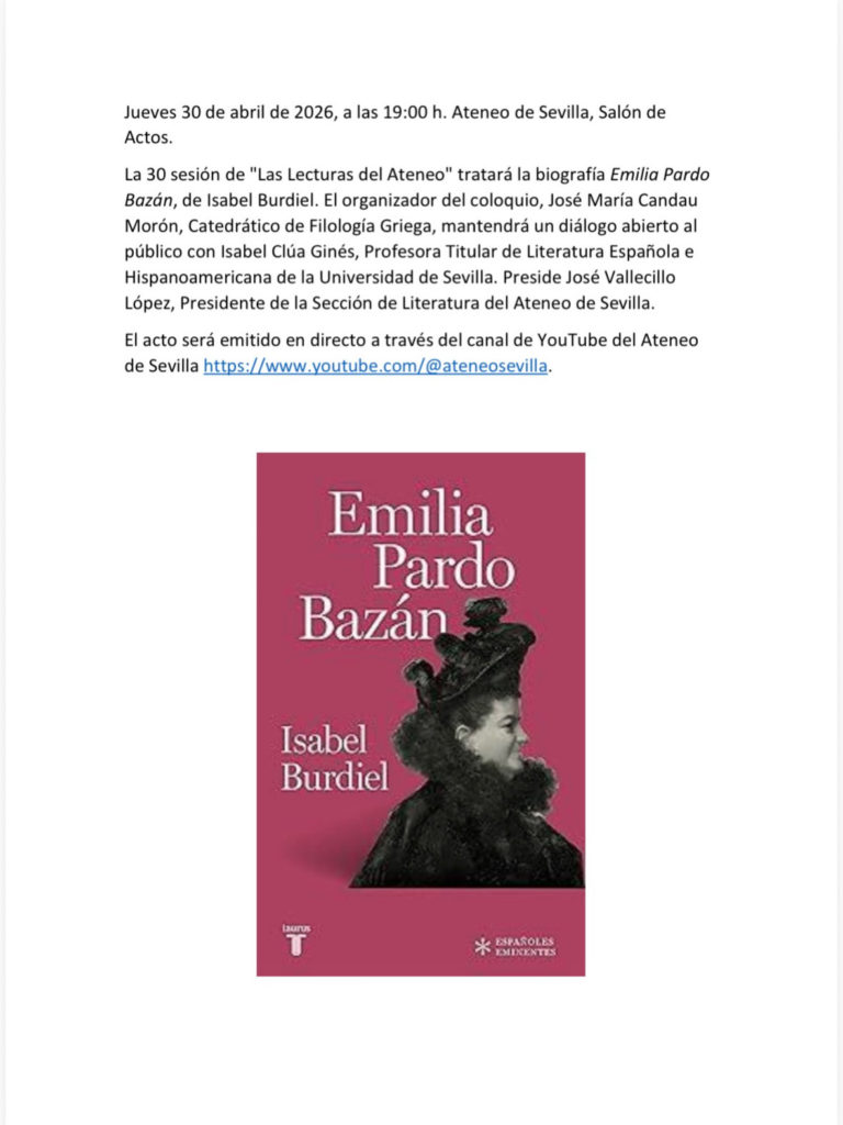 Nueva sesión de Las lecturas del Ateneo, esta vez será un diálogo abierto entre el organizador del coloquio, D. José María Candau Morón y Dña. Isabel Cluá Ginés sobre la biografía Emilia Pardo Bazán, de Isabel Burdiel. Será el 30 de abril, a las 19.00, como siempre.